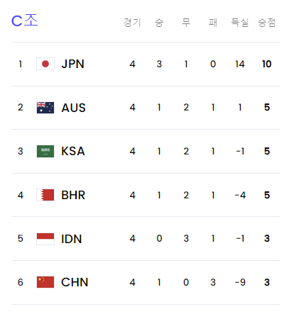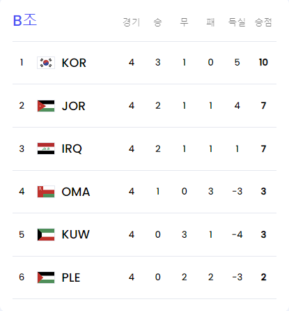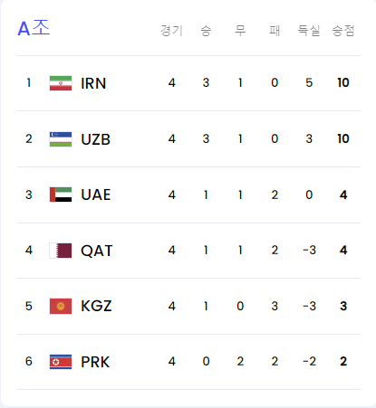 4.2026년 북중미 월드컵 아시아 3차예선 4차전 결과(순위)