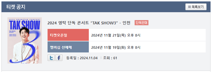 - 공연명: 2024 영탁 단독 콘서트 “TAK SHOW3” - 인천